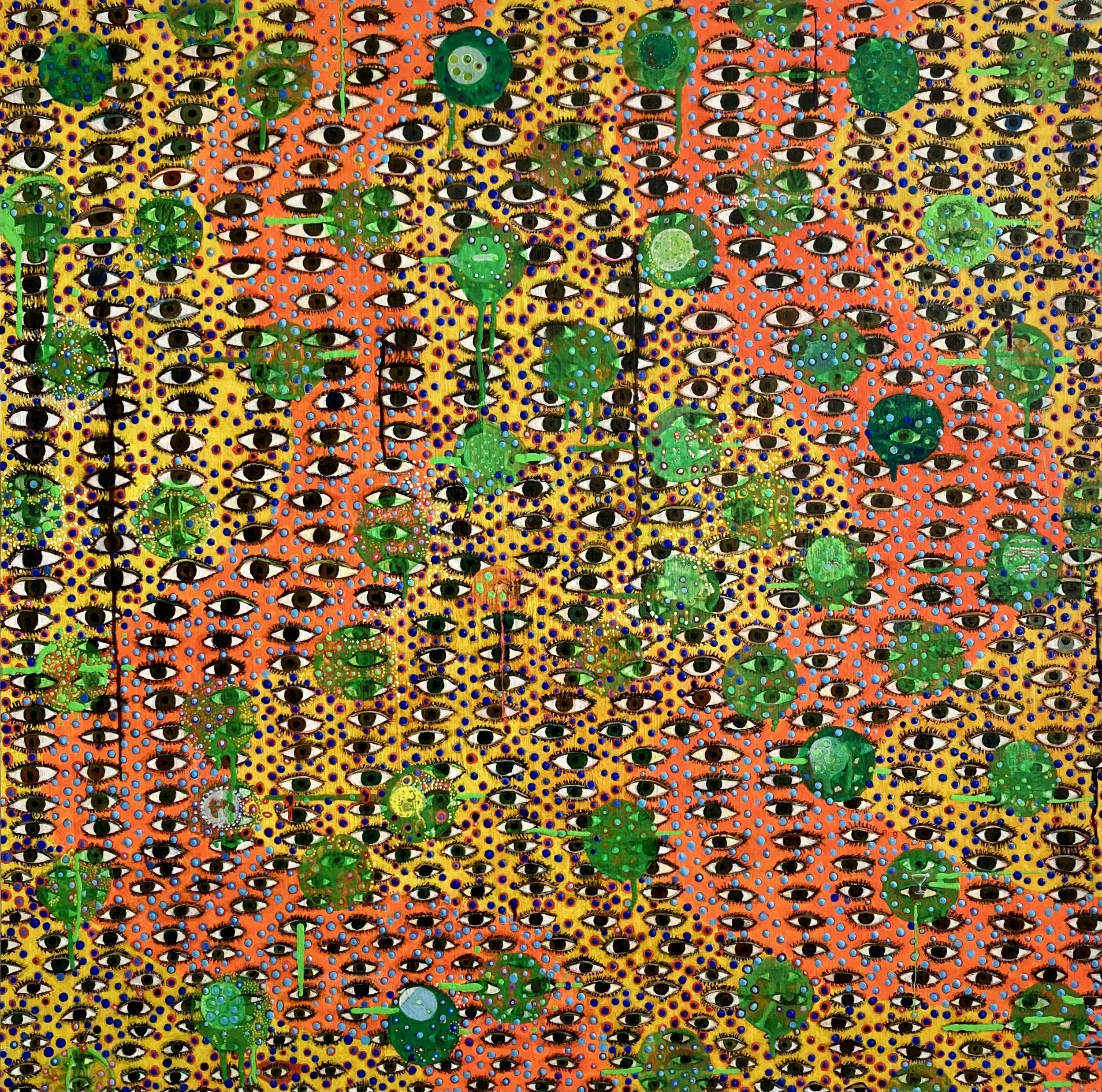 Dirty Martini Eyes, 2024, Mixed media on panel, 34 x 34 inches