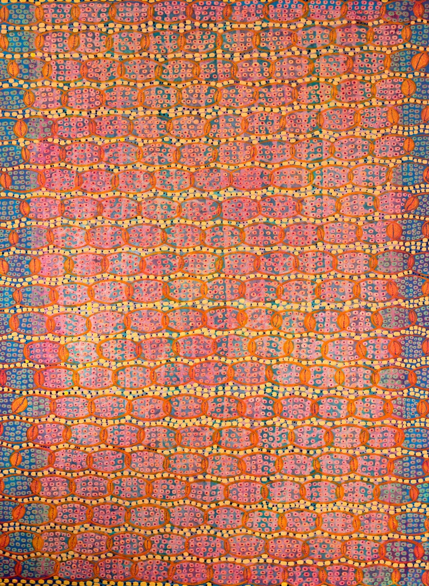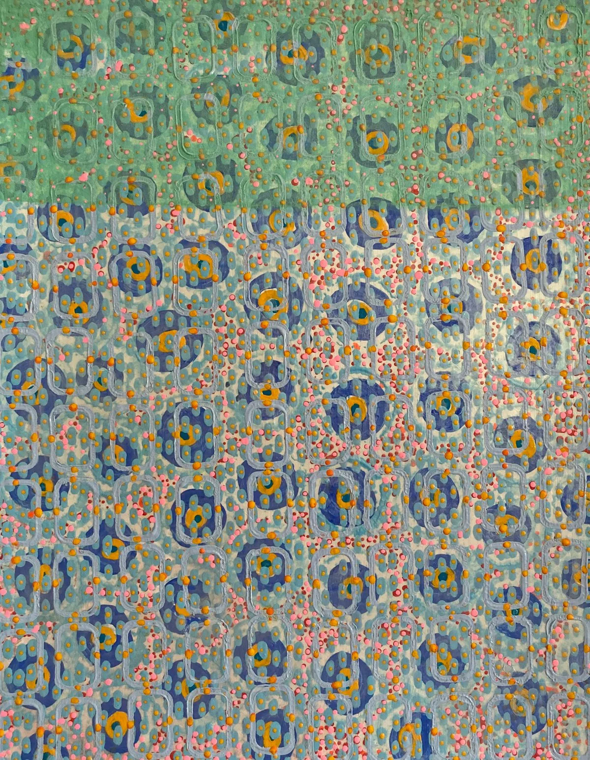The complex paintings and works on paper composed by Diane Ayott show strong evidence of engagement in the contemporary language of abstraction. Layered combinations of markings – dots, dashes, lines, slashes, circles, ovals and loops – contribute to sophisticated, overall spatial patterns and color shifts.