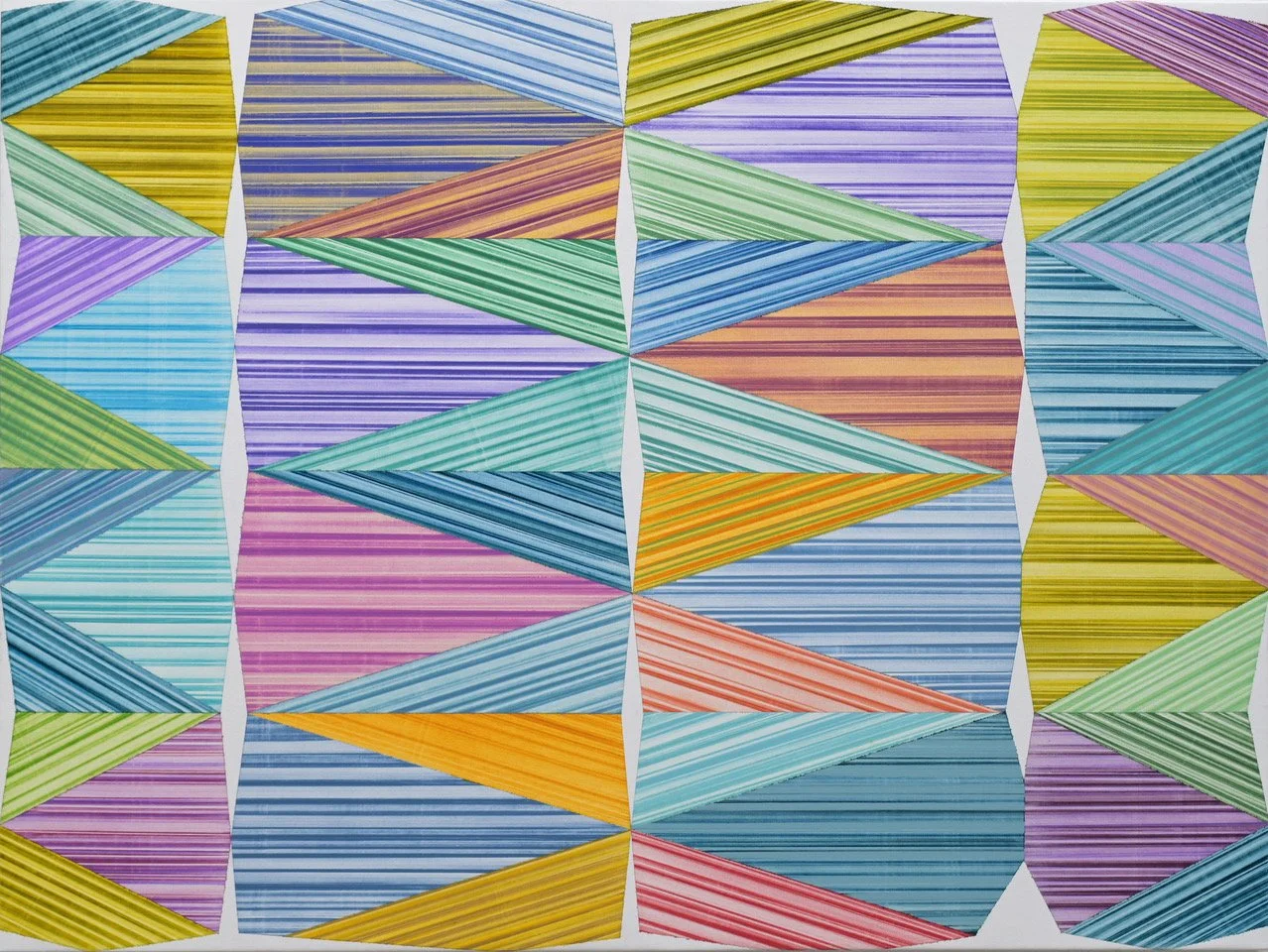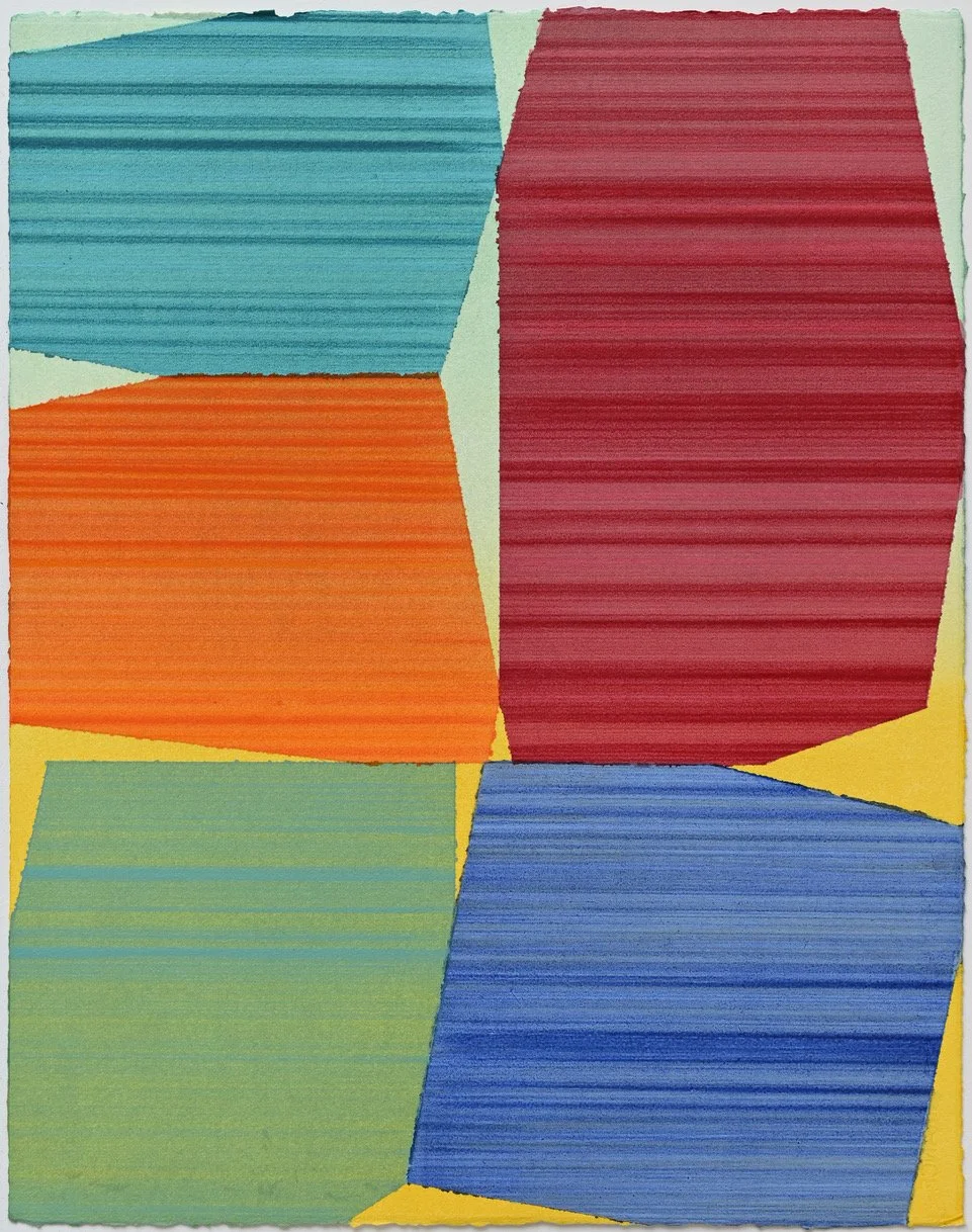 “Painting with oil on canvas is my primary activity. Through drawing I generate compositional ideas using irregular polygons in a loose grid-like structure. Within each polygon I paint successive, thin layers of color, which are dragged by hand to create rhythms and patterns. I’m engaged by the question of how color and shape create relatedness and difference, as well as emotion and mood.