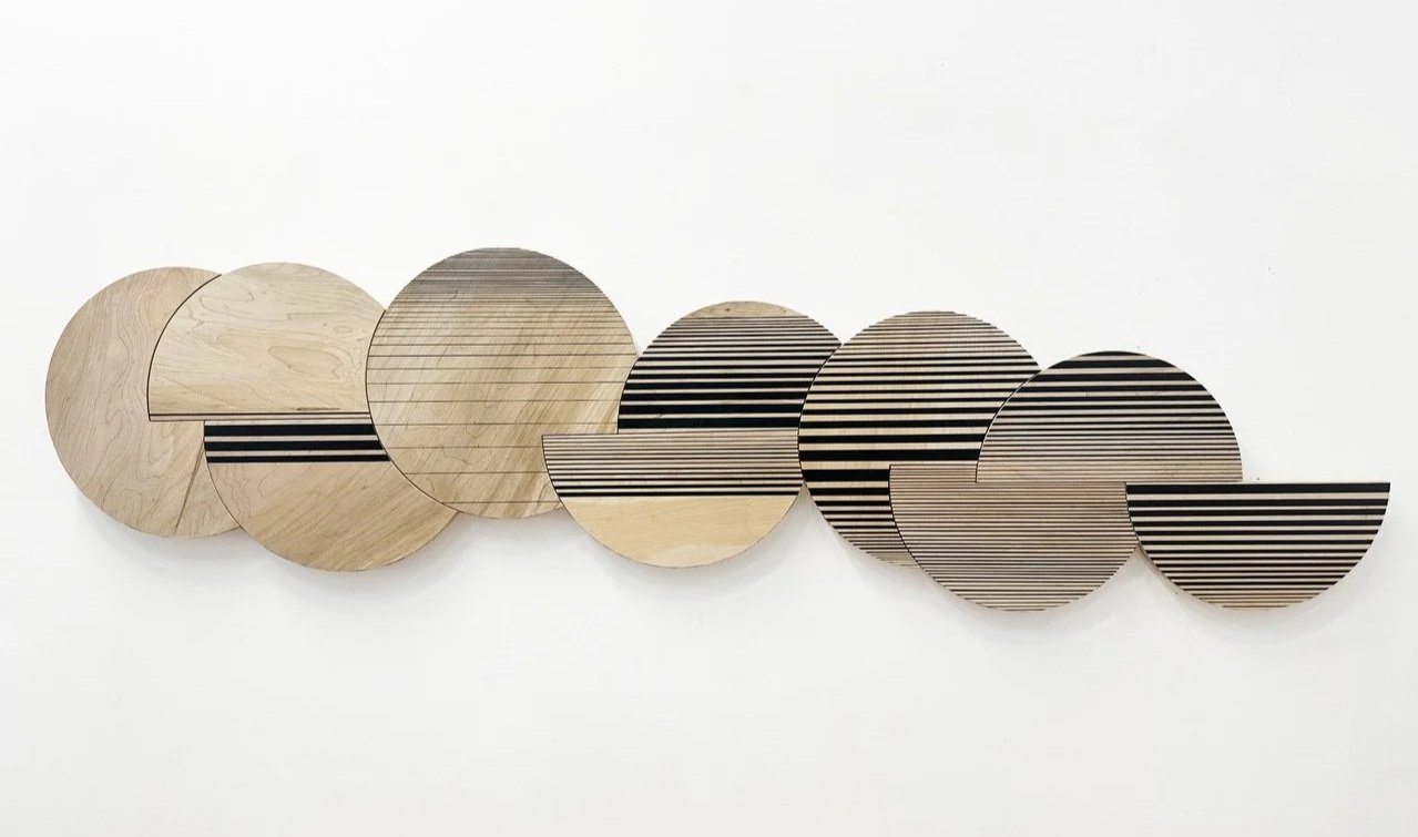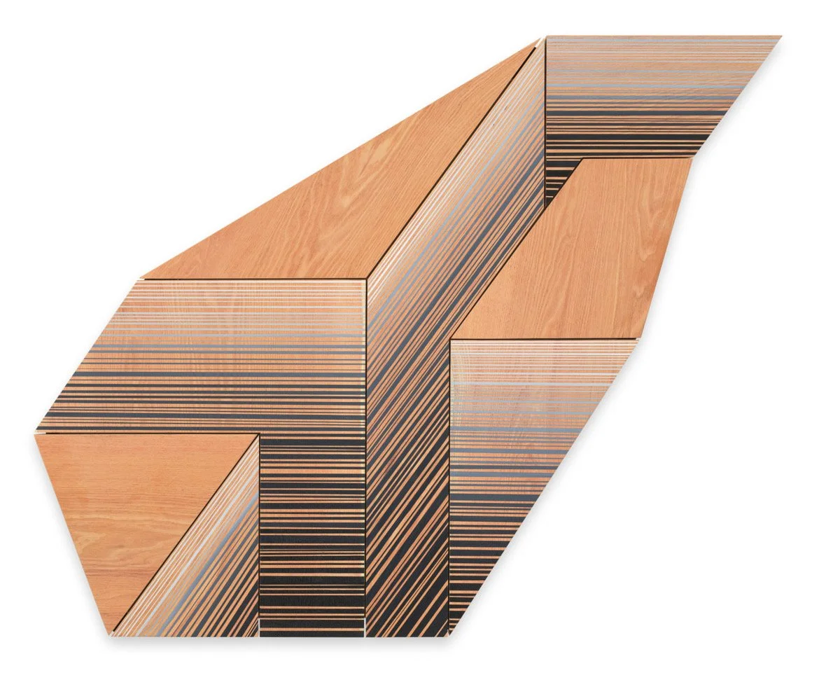 Middlebrook describes his process stating, “For the last decade or so, I’ve been working with a mill in Western Massachusetts where I source all the wood for these designs. The shapes are the basis for a series of landscape paintings which focus on the organic and the geometric pushing and pulling against each other. As I gaze out my window, I’m inspired by where the sky meets the trees and how the trees interact with the landscape. All of these works are inspired by this interaction. These wall works have evolved from my plank series and are now using multiple types of wood to make up the composition.”