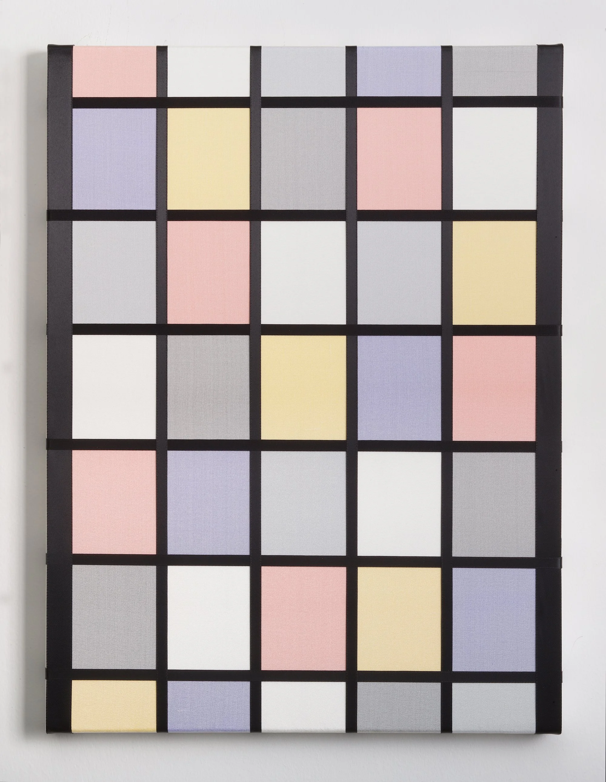 The surfaces of my paintings appear quite firm at a distance, though upon closer inspection, the felt, silk or satin ribbons add elements of softness, suppleness and sensuality to the minimal hard-edge painting. The fabrics lend additional dimensions to the paintings by referencing clothing as related to the human body. The paintings are conceptual portraits, or a kind of zoom in or detail, focusing instead on a close up of a person’s essence as decorated and protected by their clothing.