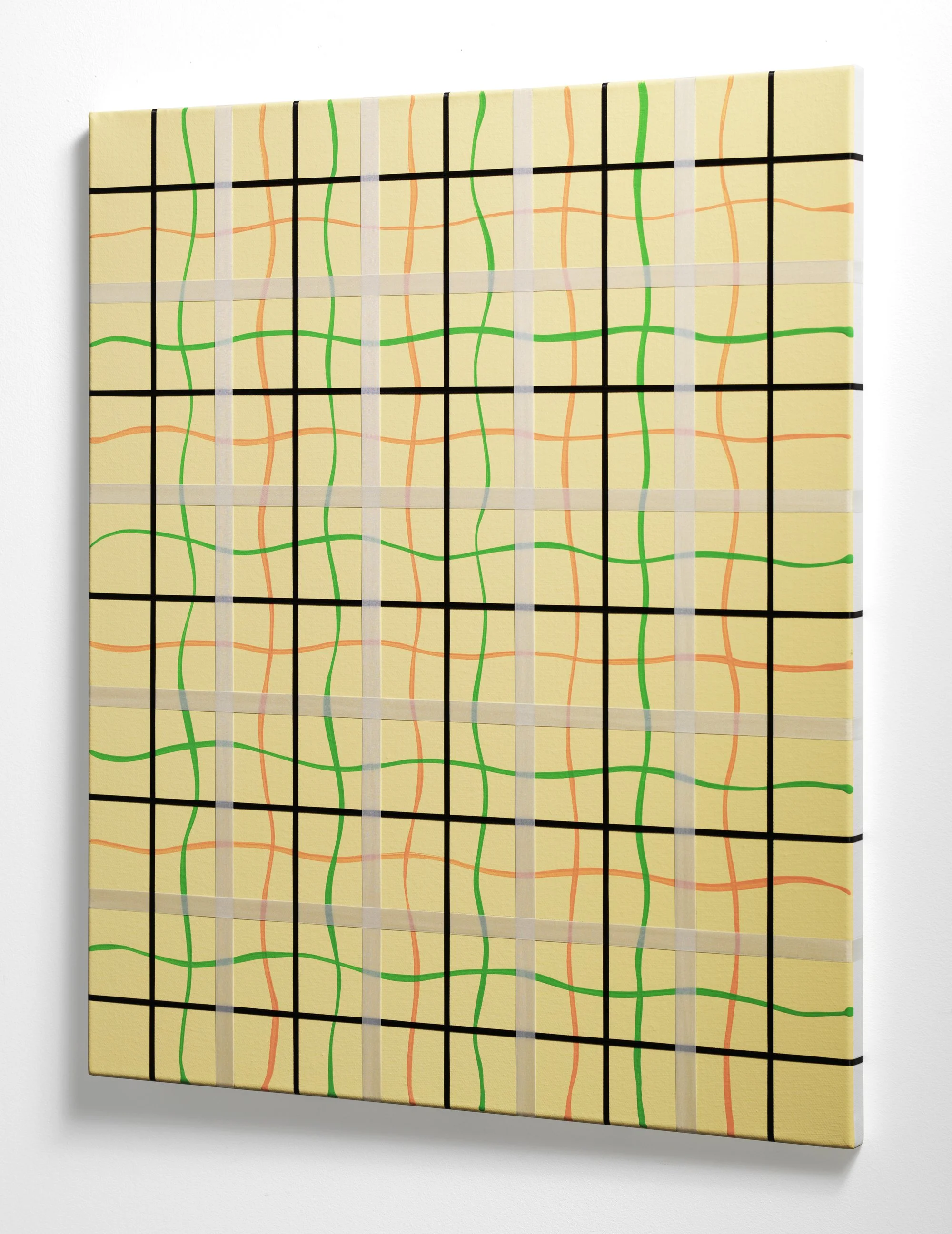 Yellow with Green-Orange Fluid Grid, 2006, Silk ribbon, satin ribbon, India ink, opaque ink, vinyl acrylic paint on canvas, 24 x 20 inches