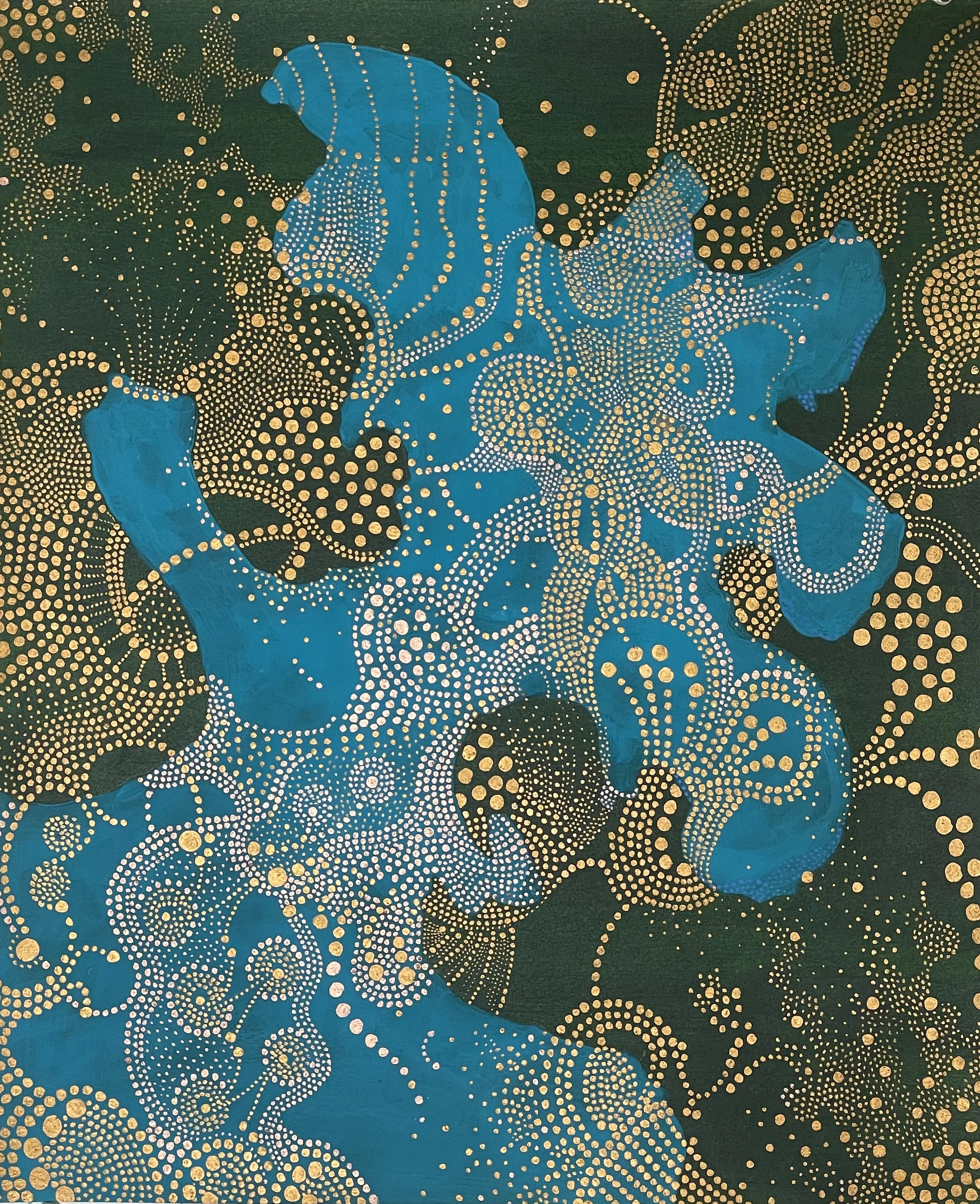 The central form suggests landmass, a non-specific geographic shape with the ground being multiple layers of deep velvety color. Contained within this larger form are thousands of small dots, each painted with two semi-circular strokes in gold acrylic and powdered pigment. In the process of painting these dots, over time, shapes form, figures emerge. As I add more marks these figures disappear into their neighbors, and a larger shape appears. Eventually some remain visible, but more are absorbed into the shimmering scrim of gold; hidden. I’ve done a series of diptychs that are larger than I am. As I paint I feel that I’m travelling through a series of events, moving back and forth, up and down. The smaller pieces, painted at my table, can be seen in their entirety as I work, and are more intimate. These paintings are both more intuitively and more directly executed than other work- they have less “concept” to hang their hat on, less of a conceptual middle ground between impulse and object.
