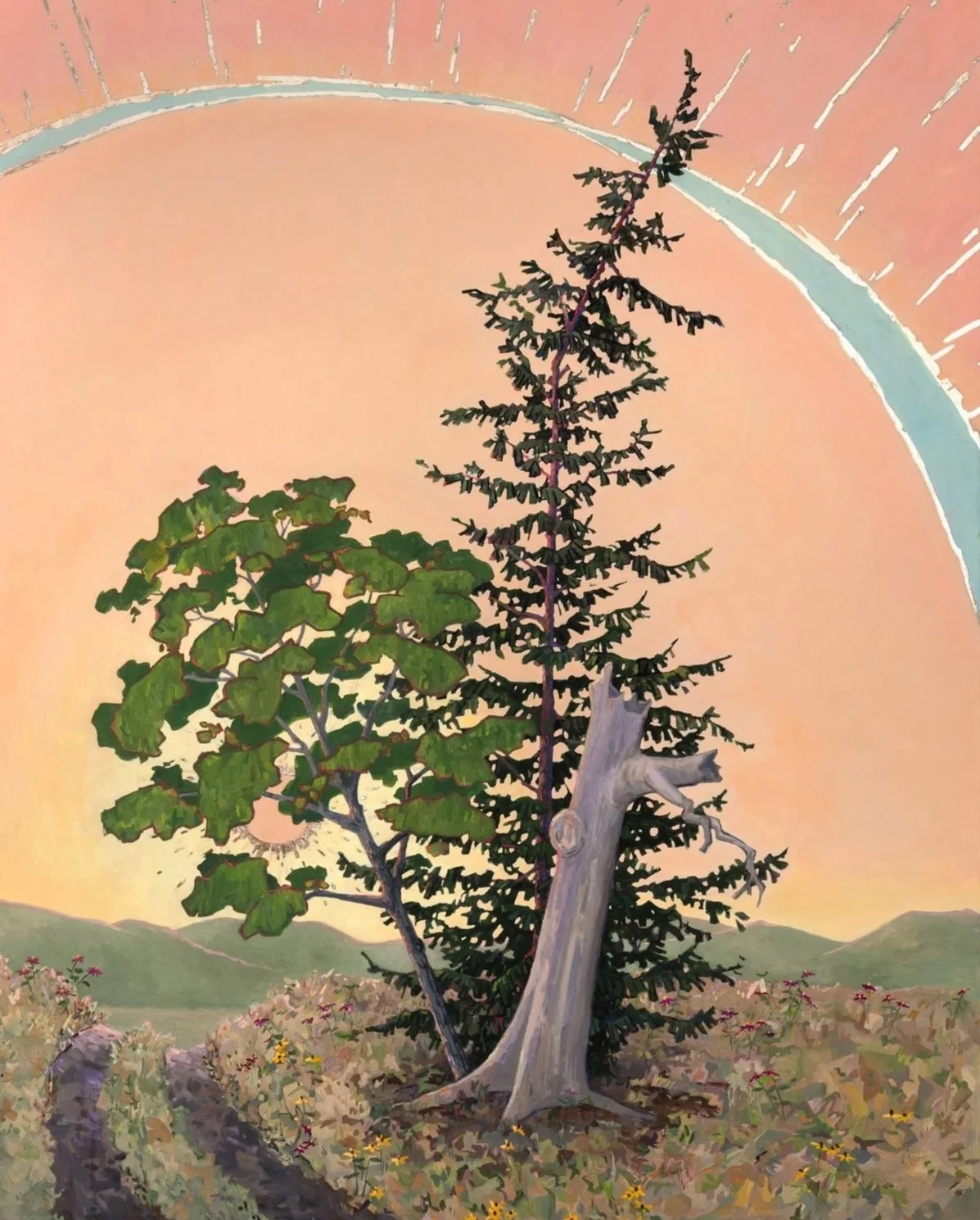 The Clearing, 2025, Oil on linen with yellow, white, rose and champagne gold and platinum leaf, 29 x 46 inches