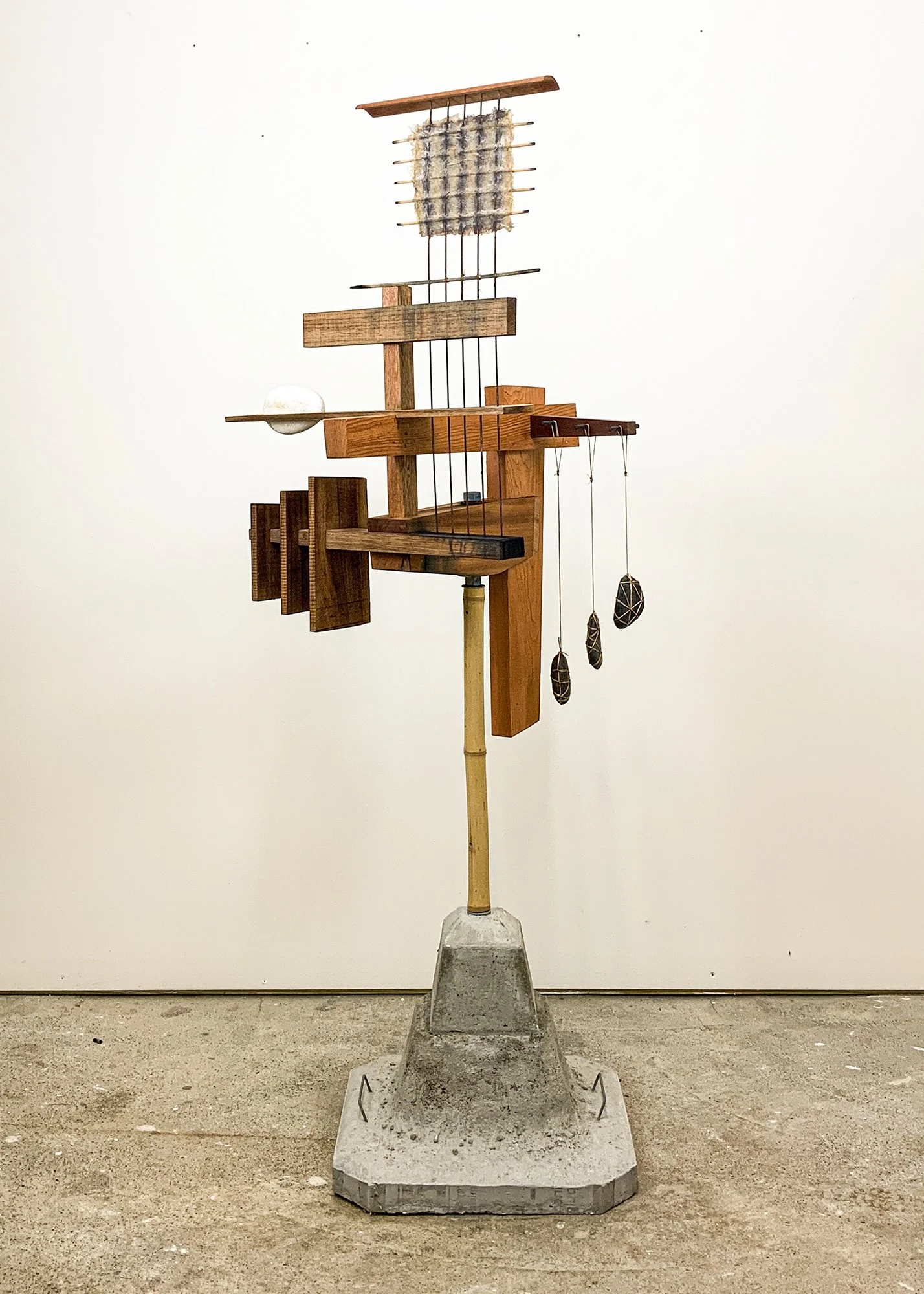 Environmental Structure No. 3, 2018, Wood, stone, pigment, twine, 28 x 12 x 10 inches