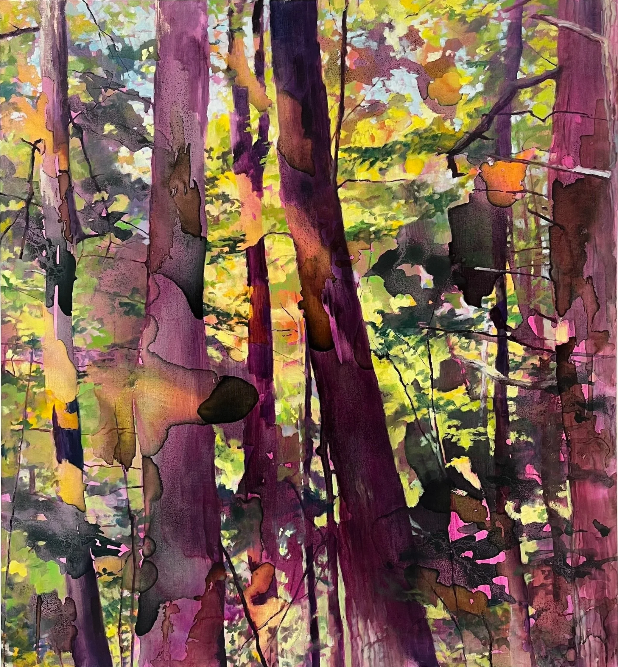 Hemlock Grove, 2025, Homemade hemlock, buckthorn, and walnut ink, synthetic inks, and oil on linen, 48 x 44 inches