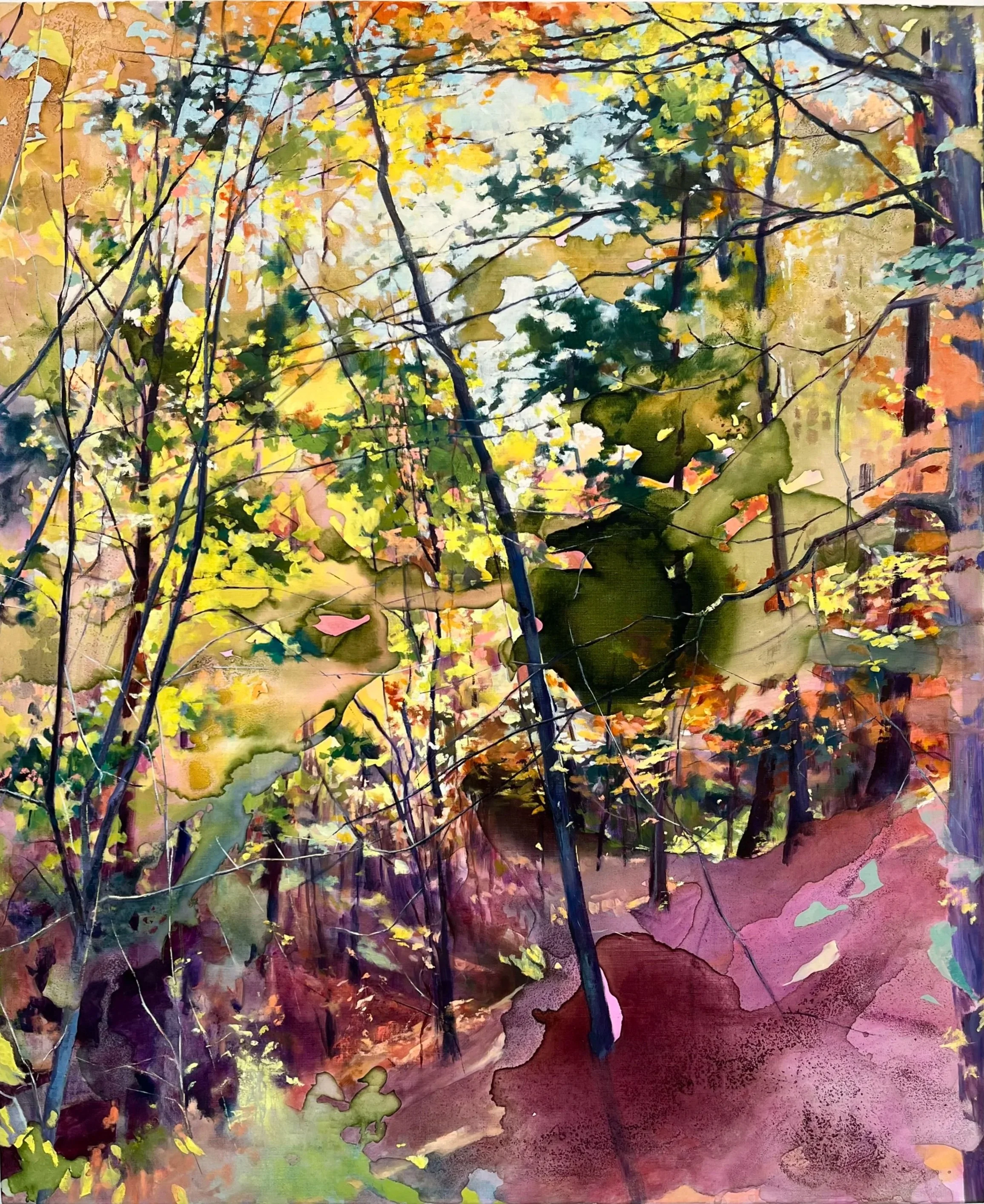 Lisha Kill Fall, 2026, Homemade buckthorn, acorn, and goldenrod inks, synthetic inks, and oil on linen, 46 x 38 inches