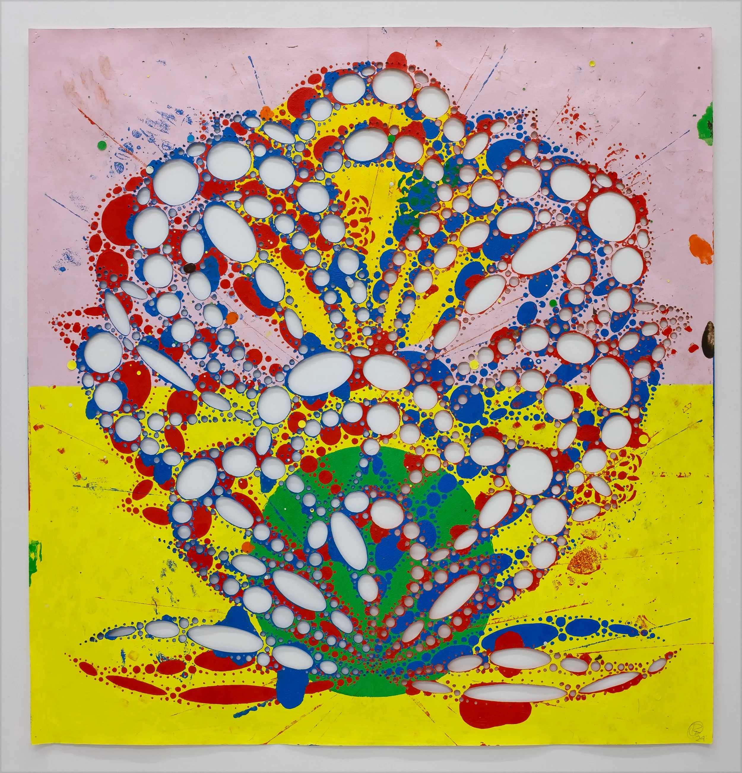 Secret Sun, 2025, Flashe, acrylic, and UV varnish on hand cut paper, 29 x 27 inches