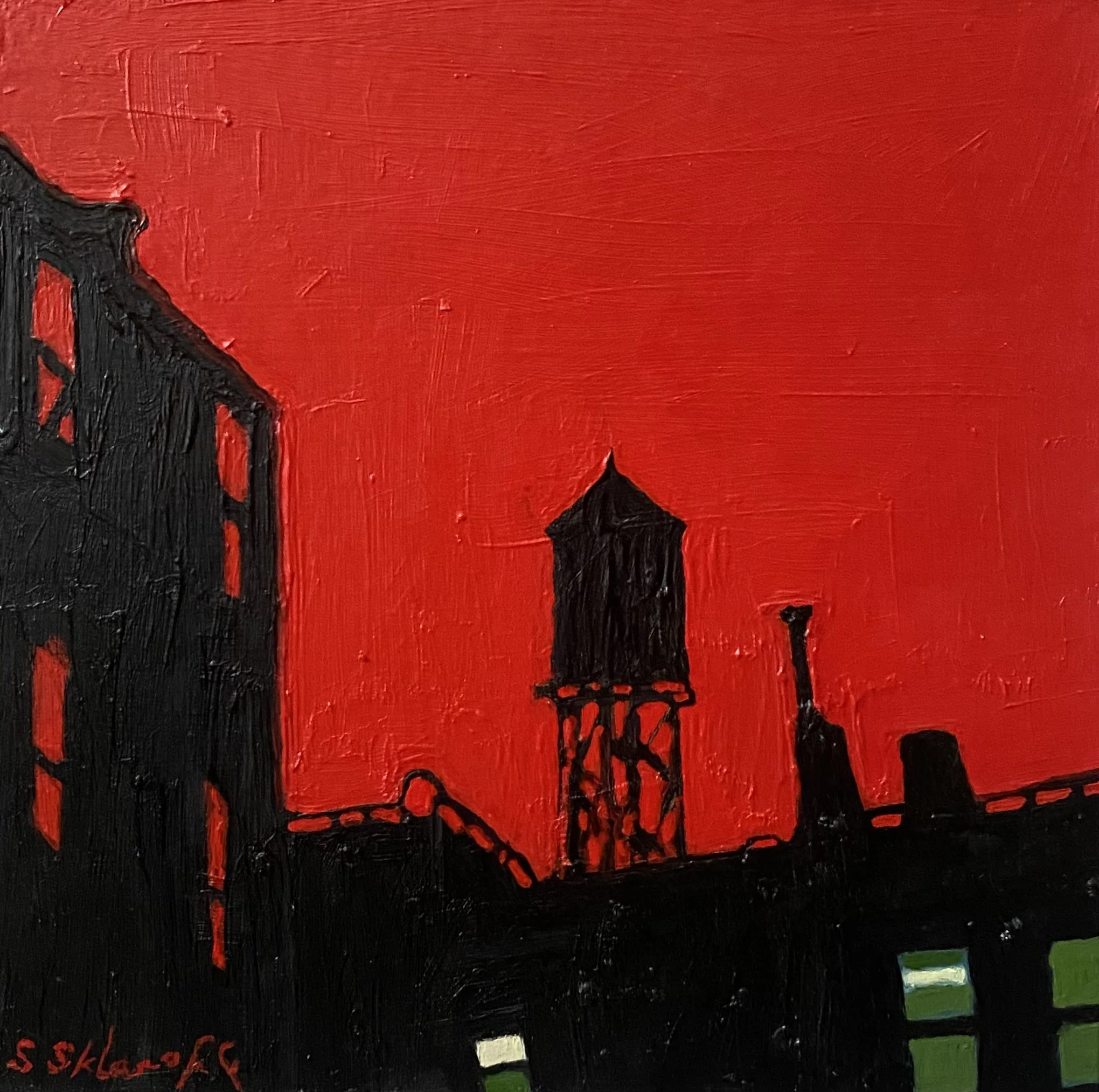Sonya Sklaroff’s work records her experiences in the world around her. Her new work focuses on the relationship between abstraction and representation. She is inspired by objects and scenes she encounters in her daily life and her travels, and either paints on location or in her studio using a stream of consciousness spontaneous layering technique. She experiments with texture, color, and imagery to create joyous and bold explosions of pattern, light, and form.