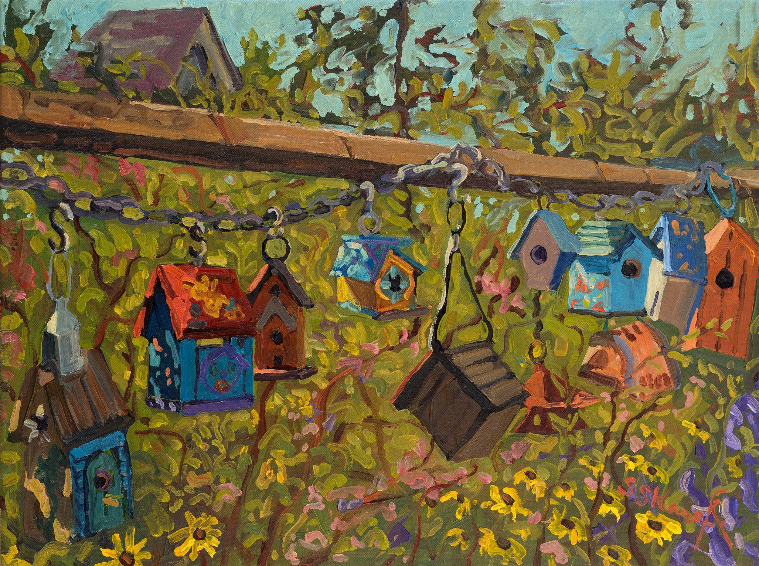 11 Birdhouses in a Row, 2017, Oil on canvas, 18 x 24 inches