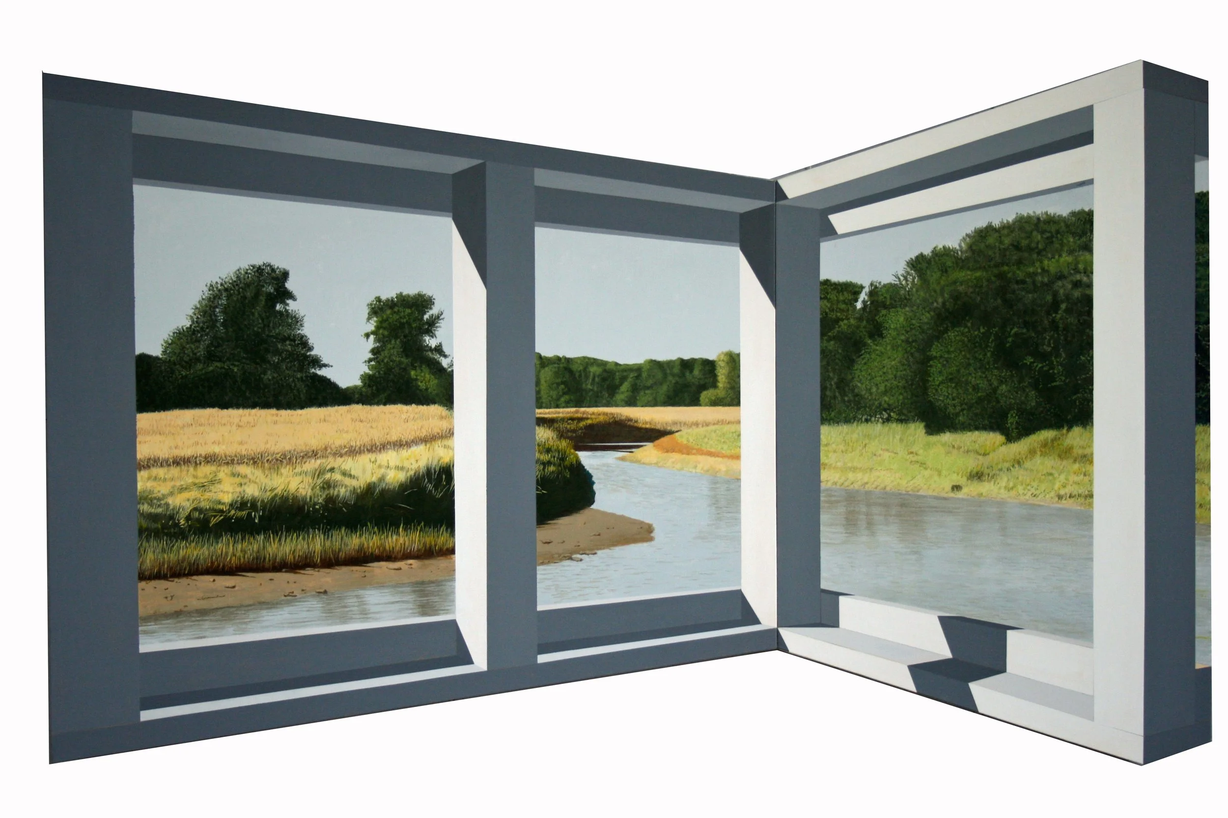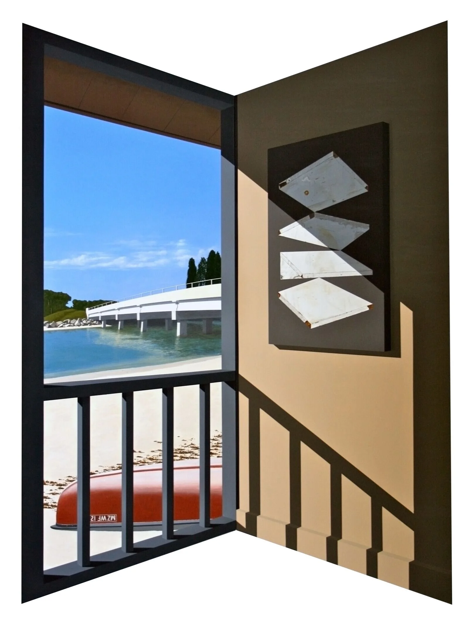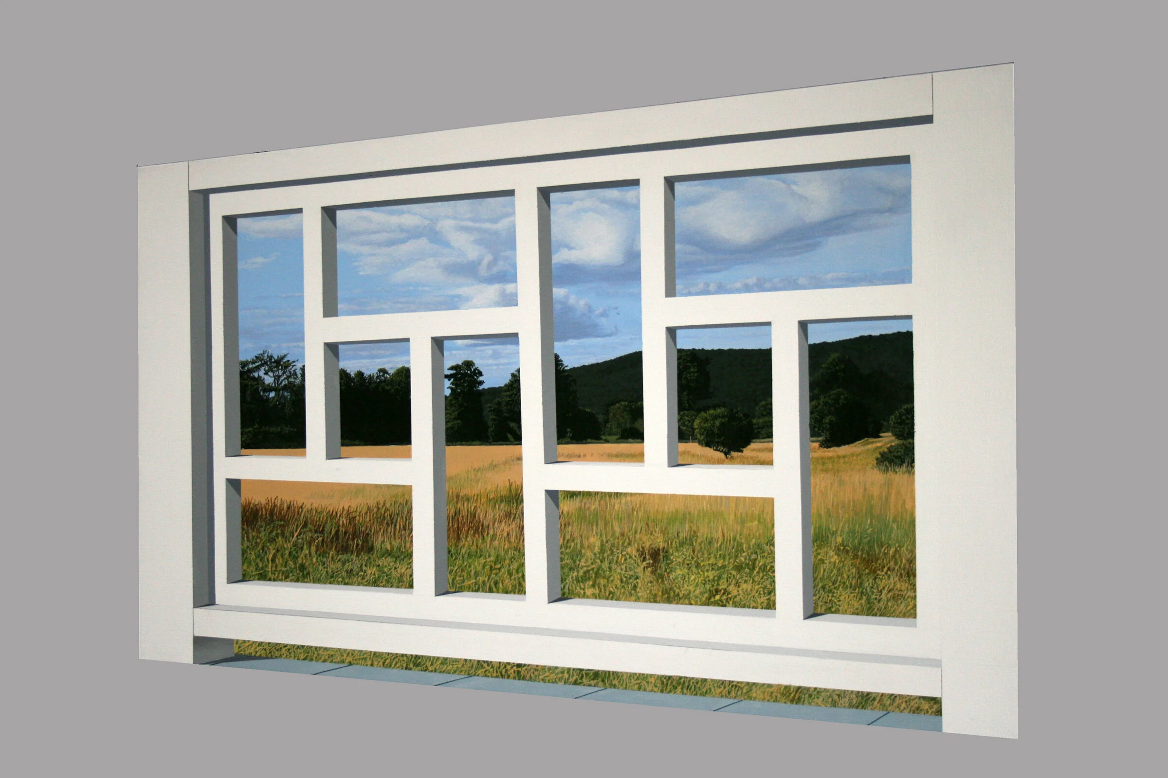 Warner Friedman is an American modern contemporary landscape artist who uses shaped canvases to display vivid scenes set behind an architectural structure such as a fence, a gate, a window or a door. Friedman makes his paintings so realistic by building models and photographing the natural light falling on the scene.
